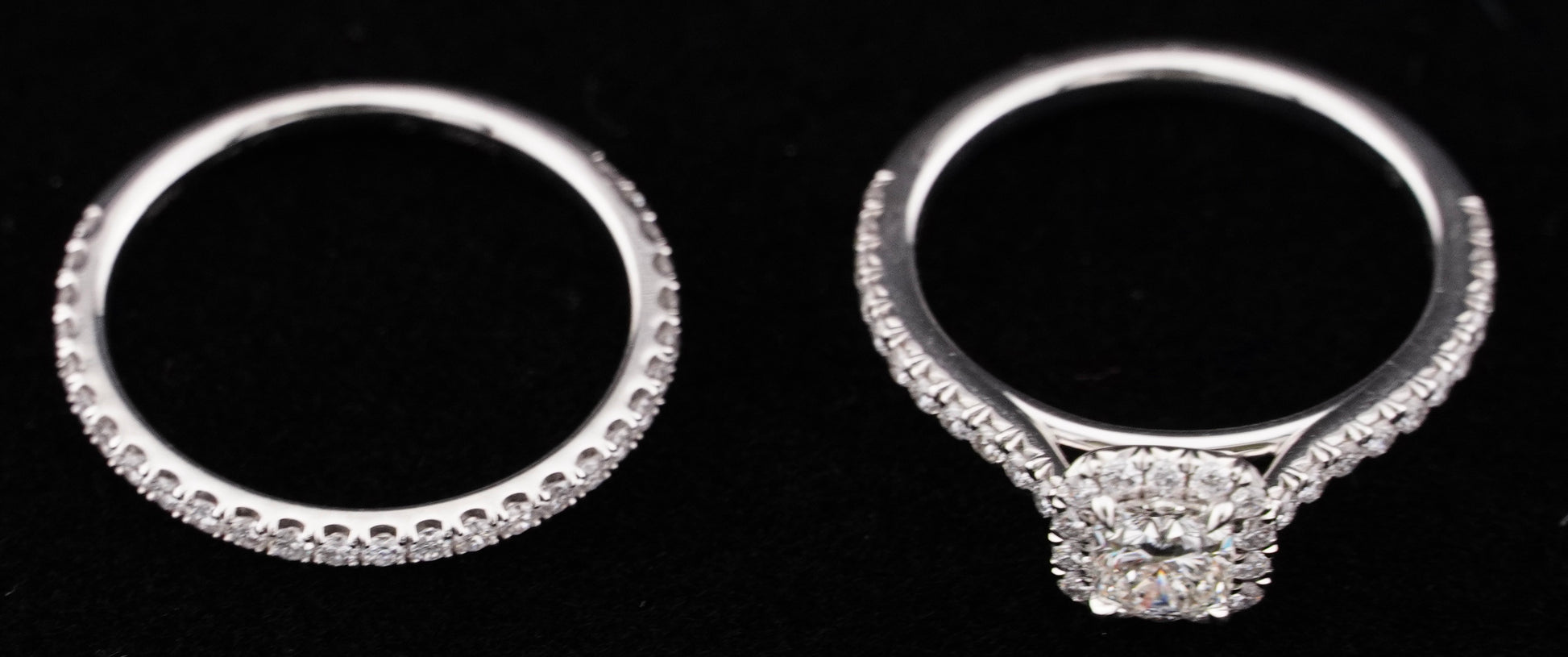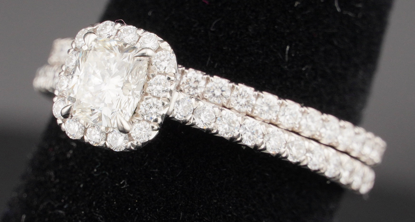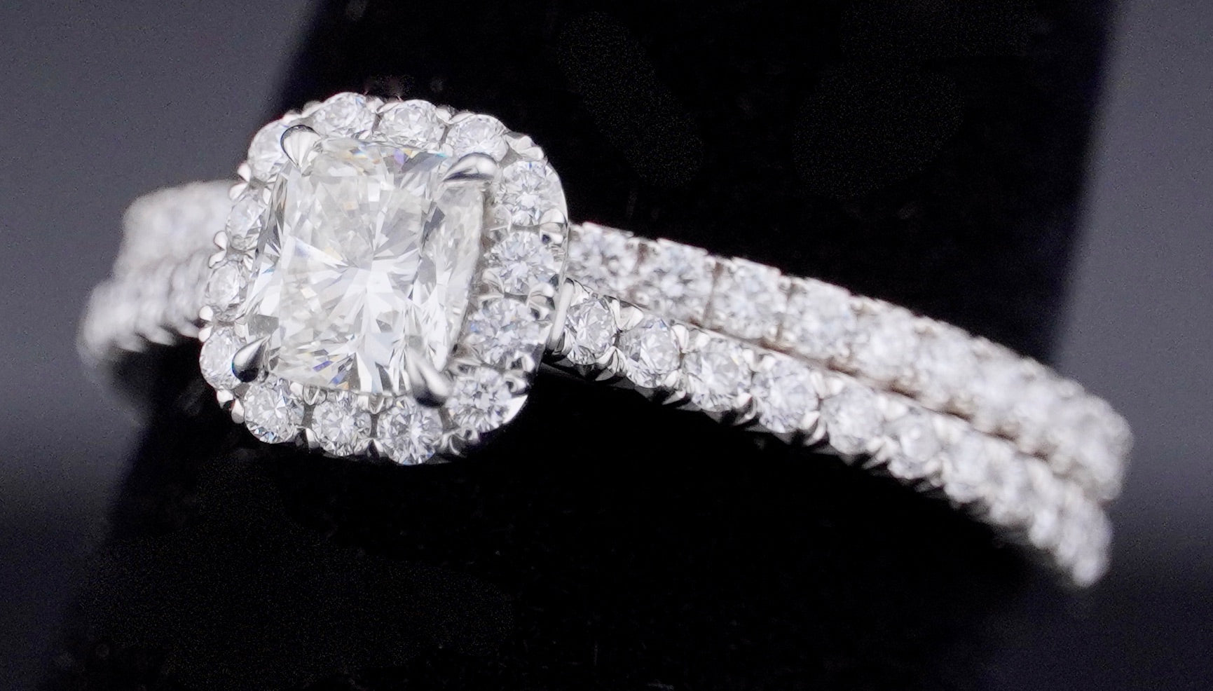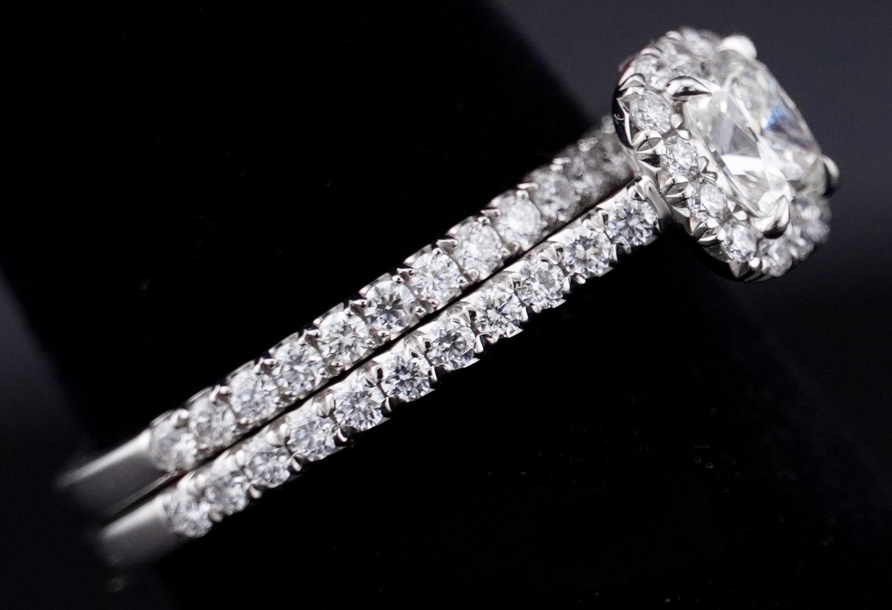 This engagement ring and wedding band set includes a 0.51-carat cushion-cut H VS2 diamond halo set in platinum, accented by 36 round brilliant G VS diamonds totaling 0.36 carats. The matching lady’s platinum wedding band features 28 round brilliant G VS diamonds totaling 0.03 carats. Originally purchased in 2020 for $3,700, the set comes with its original papers and box. Crafted by Colonial Jewelers, a respected Maryland multi-generational jeweler, it is a size 6.5 and is in excellent pre-owned condition with no significant signs of wear. Please see photos for more details.