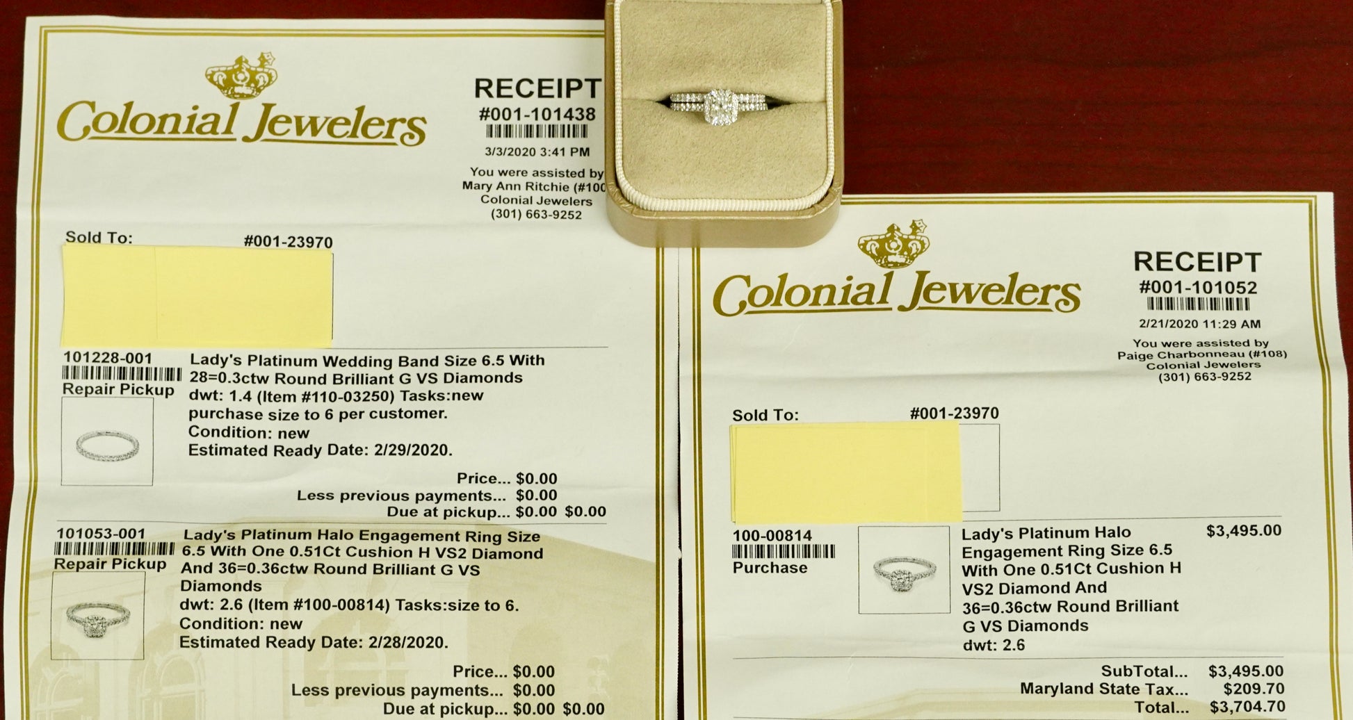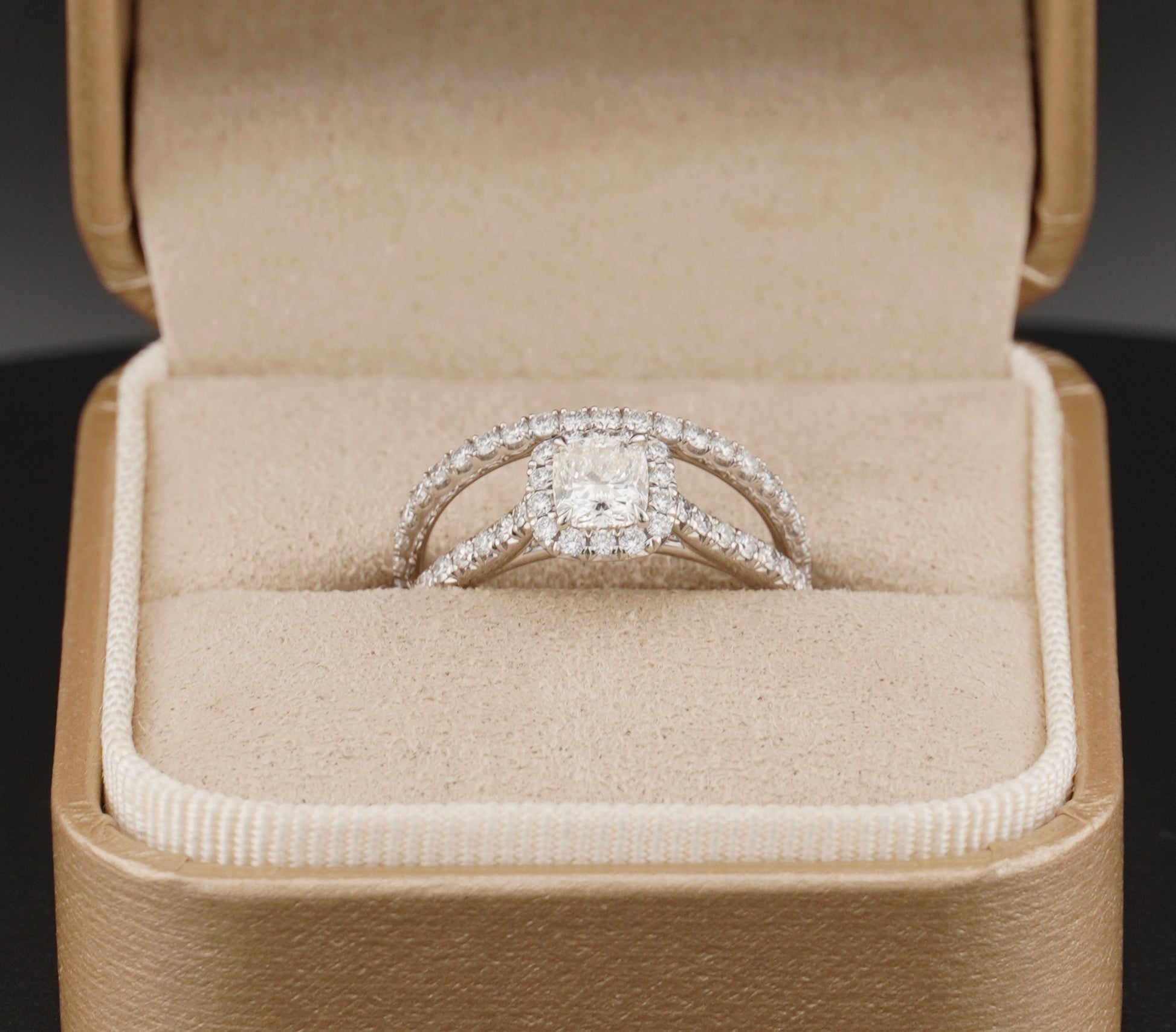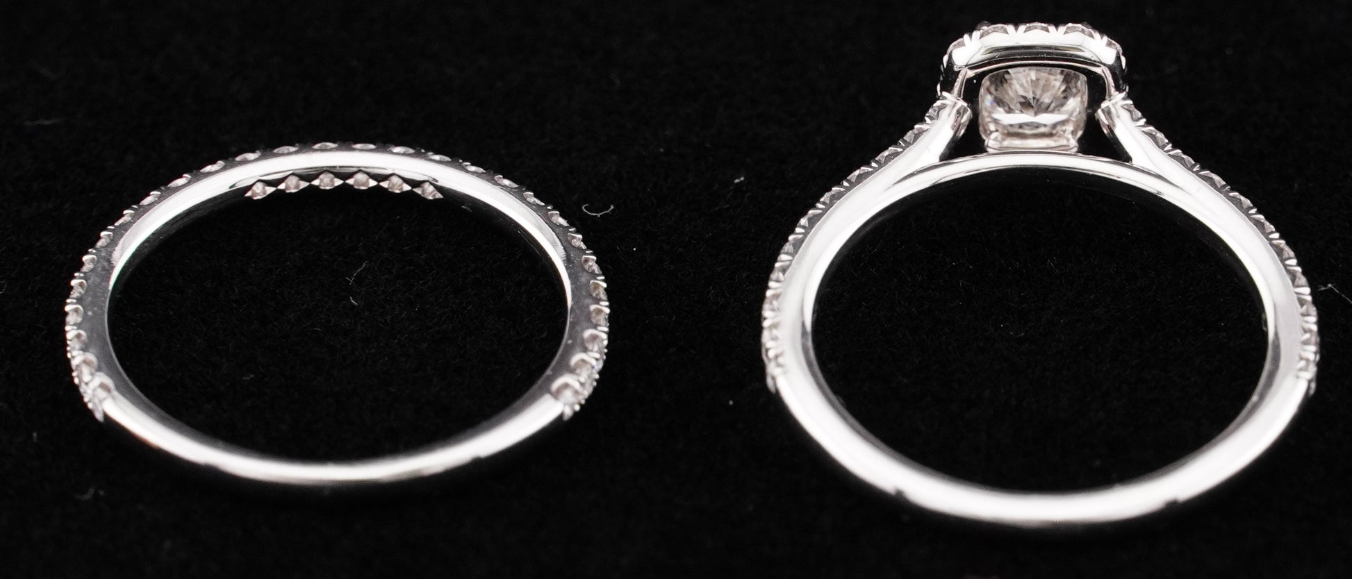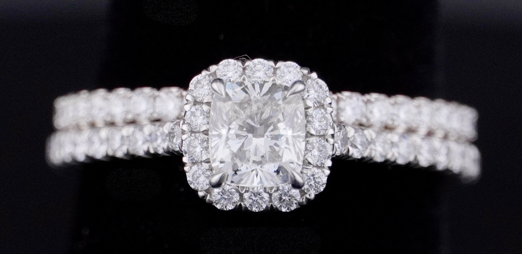 This engagement ring and wedding band set includes a 0.51-carat cushion-cut H VS2 diamond halo set in platinum, accented by 36 round brilliant G VS diamonds totaling 0.36 carats. The matching lady’s platinum wedding band features 28 round brilliant G VS diamonds totaling 0.03 carats. Originally purchased in 2020 for $3,700, the set comes with its original papers and box. Crafted by Colonial Jewelers, a respected Maryland multi-generational jeweler, it is a size 6.5 and is in excellent pre-owned condition with no significant signs of wear. Please see photos for more details.