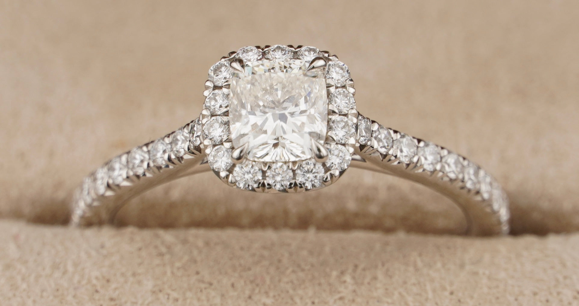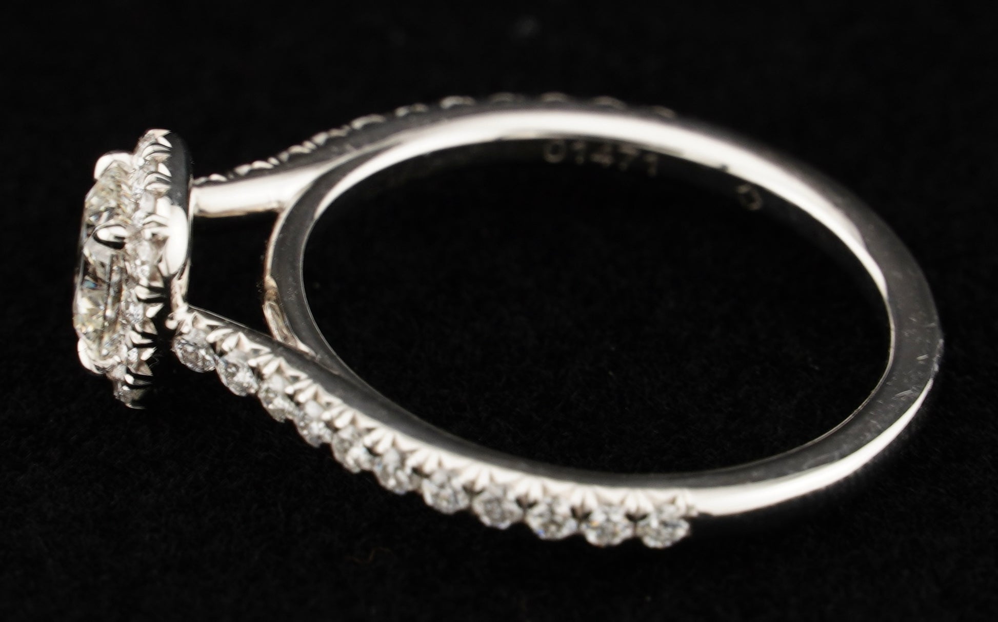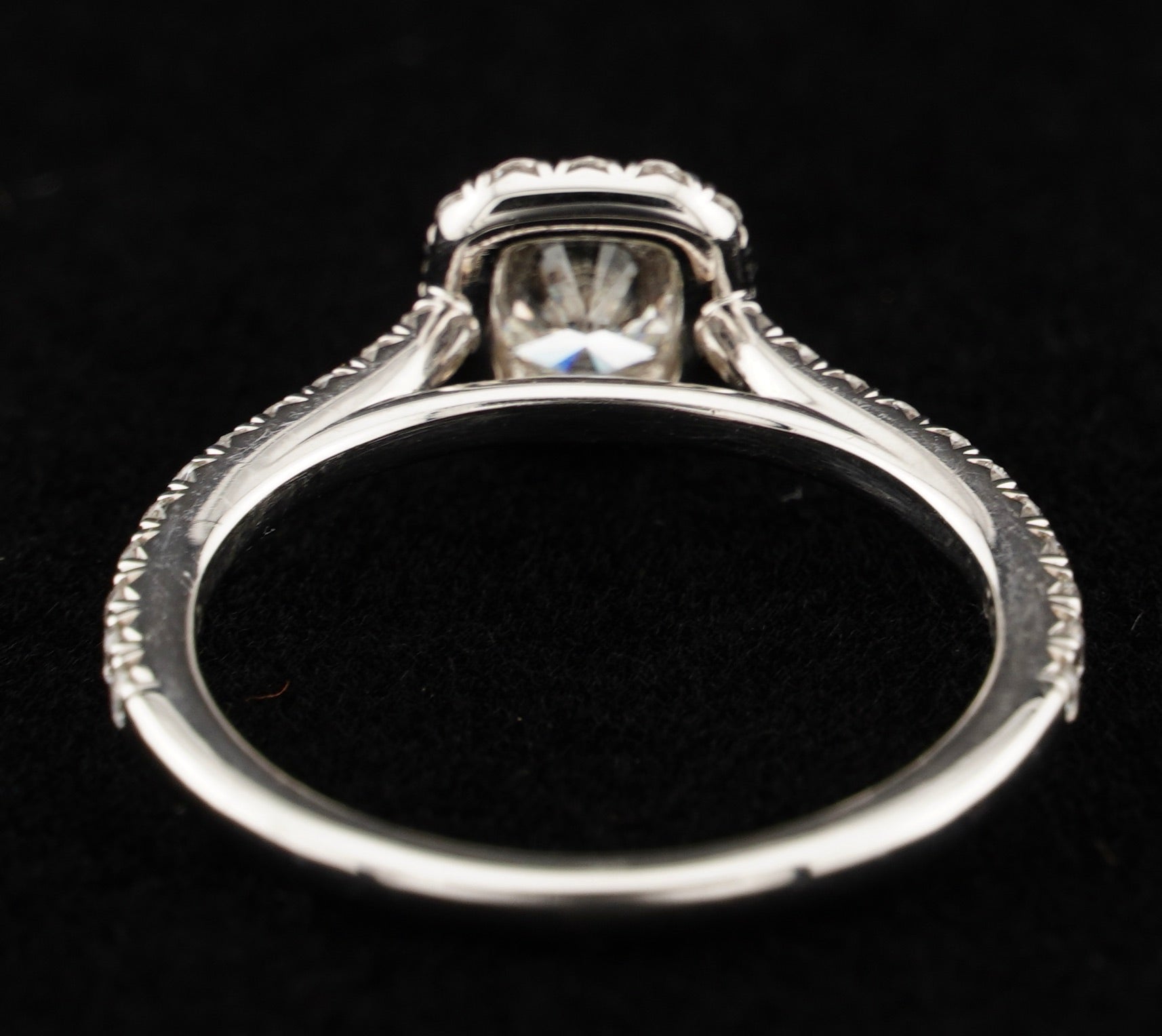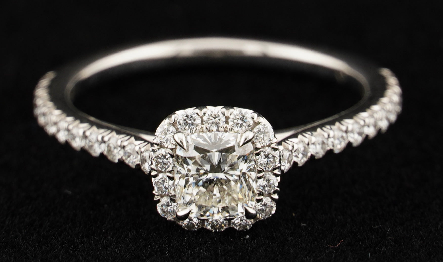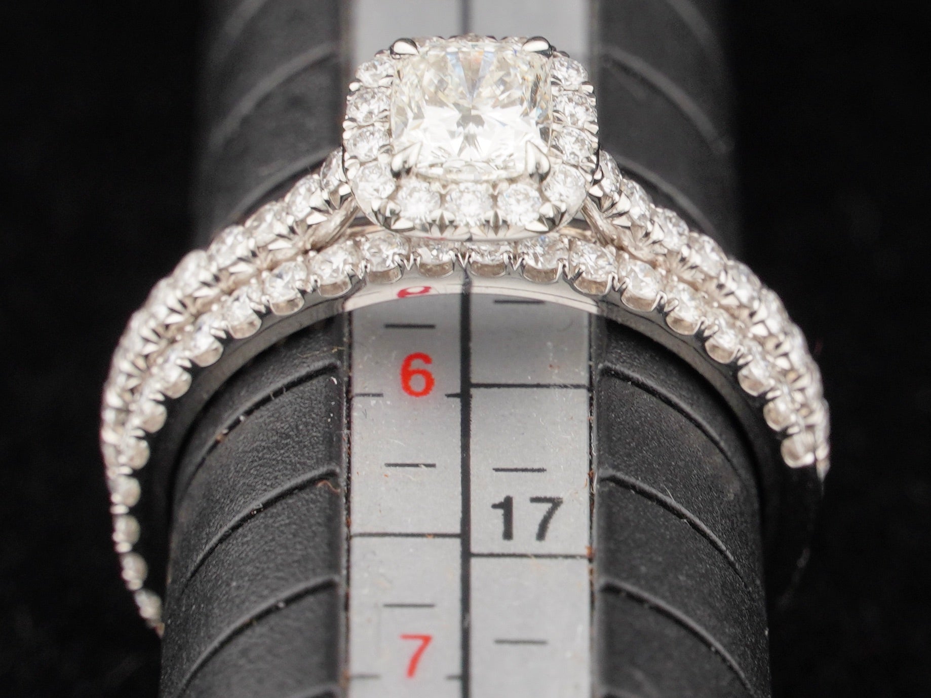 0.51Ct Cushion H VS2 Diamond in a Platinum Halo Setting with 36= .36ctw Round Brilliant G VS Diamonds Paired with a 28=.03ctw Round Brilliant G VS Diamond Platinum Wedding Band SIZE 6.5