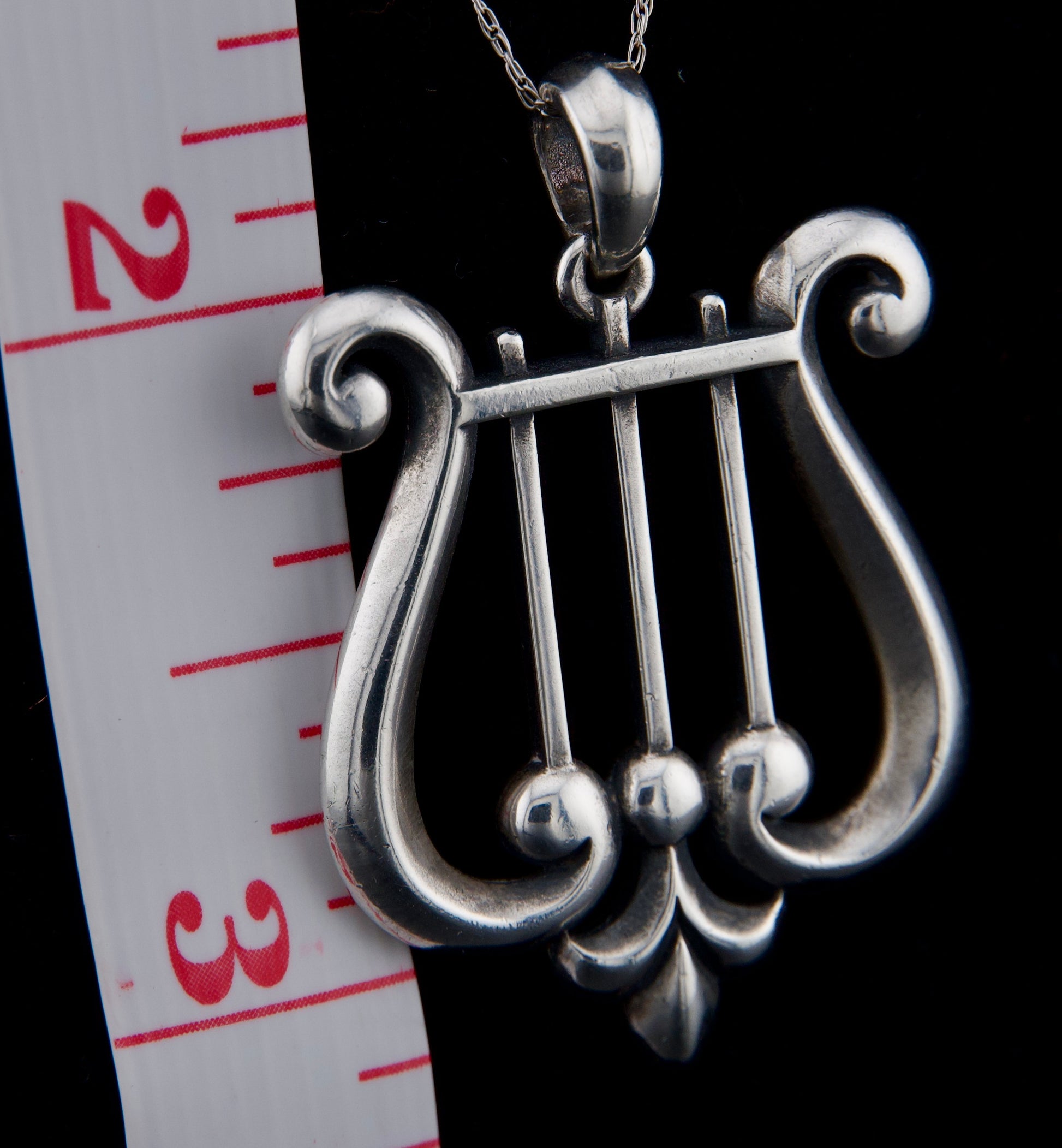 Retired James Avery Sterling Silver Lyre Harp Pendant showcasing exceptional craftsmanship and significant weight at 7.05 grams. This substantial 1.5-inch piece holds special significance as a symbol of Alpha Chi Omega sorority. Meticulously maintained in pristine condition, this distinguished collector's item exemplifies James Avery's renowned silversmithing artistry.